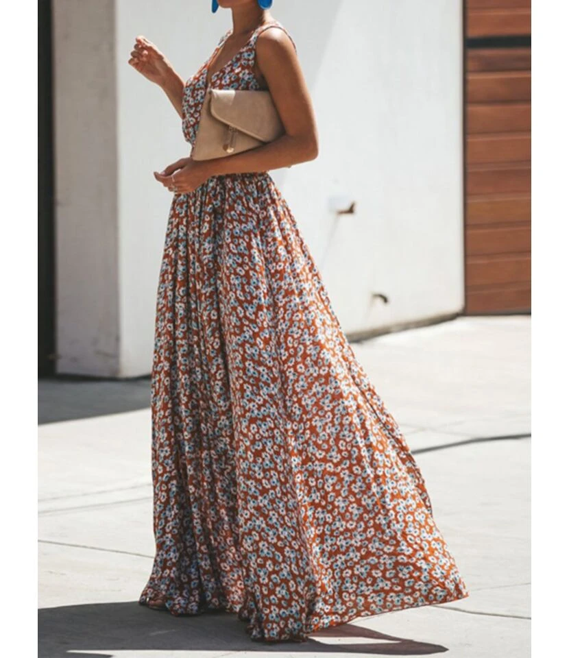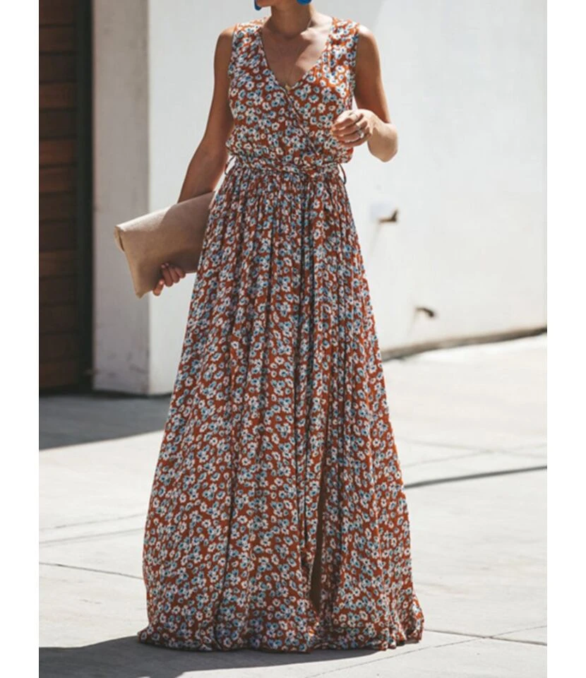 Bohemian V-neck Floral Print Tie Up Split Maxi-Dress 210528724