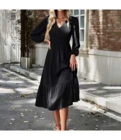 Women Cold Shoulder V Neck Plain Color Pleated Slit Hem Wholesale Swing Dresses SDN580889
