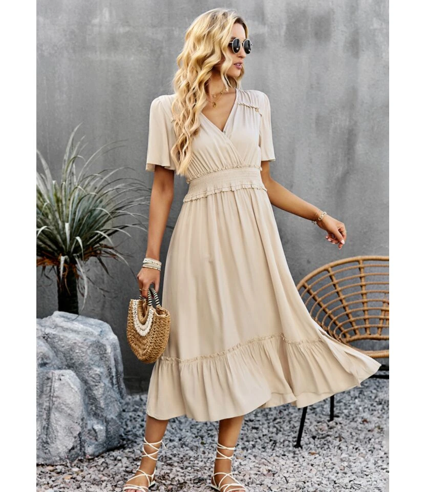 Solid Color V-Neck Waist Short-Sleeve Casual Ruffled Dress Wholesale Dresses SDN537952