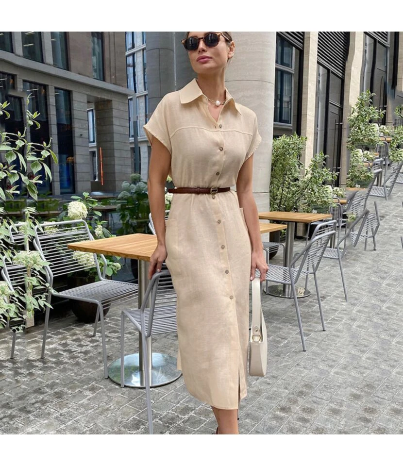 Elegant Solid Color Short Sleeve Single-Breasted Lapel Long Shirt Dress With Waistband Wholesale Dresses N5323032800057