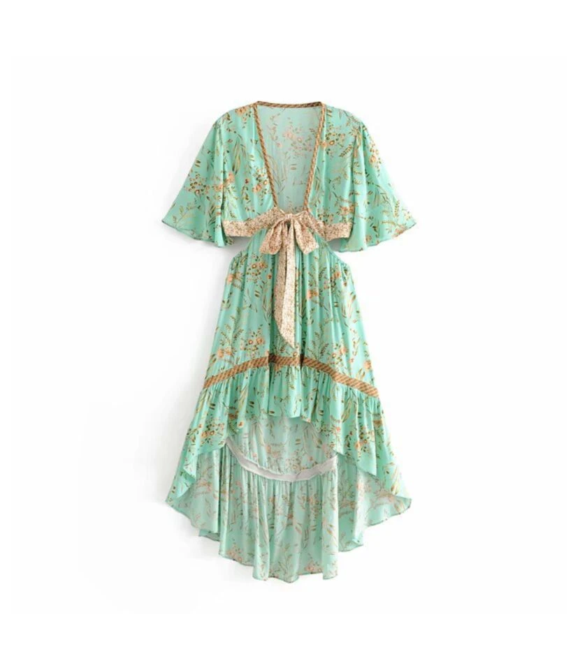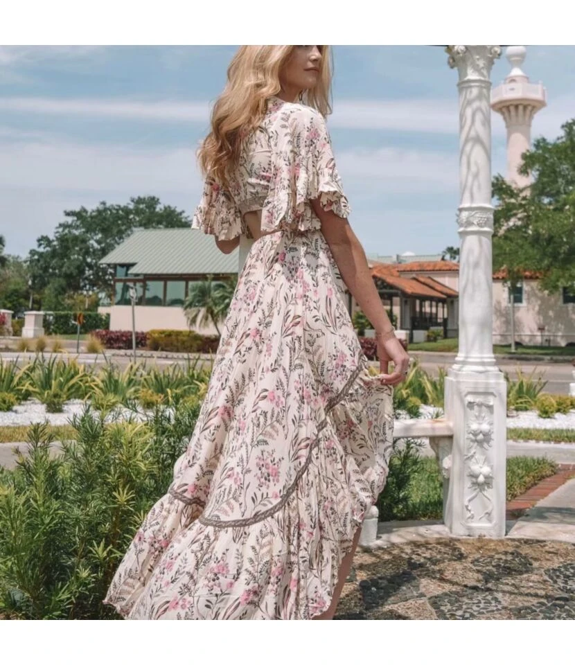 Floral Print Deep-V Neck Flare Sleeve Lace-Up Cutout Irregular Hem Resort Maxi Dresses Wholesale Bohemian Dress For Women SDN532371