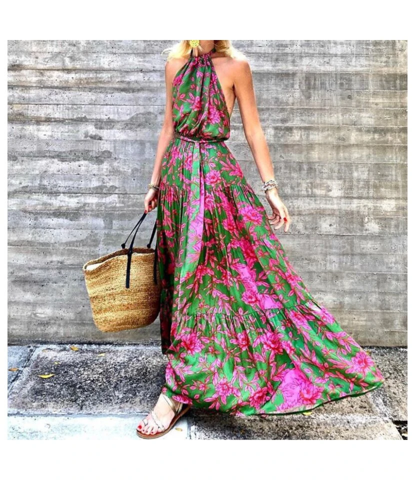 Floral Print Halterneck Off Shoulder Backless Large Swing Dress Resort Wholesale Maxi Dresses SDN533169