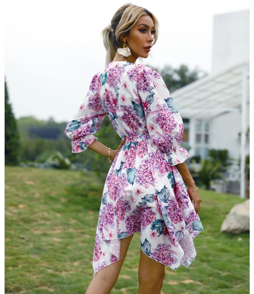 Floral Printed V Neck Tie-Up Waist Half Sleeve Irregular Hem Dress Casual Wholesale Dresses SDN532791