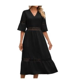 Solid Color V-Neck Hollow Stitching Mid-Sleeve Commuter Dress Wholesale Dresses N4623052500032