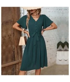 Commuting Short-Sleeved Solid Color Pleated V-Neck Dress Wholesale Dresses N461623030900084