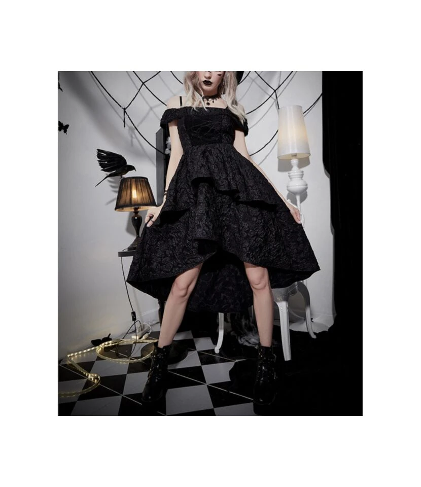 Dark Goth Halloween Jacquard Bubble Sleeve Short Dress Wholesale Dresses V5923041900044