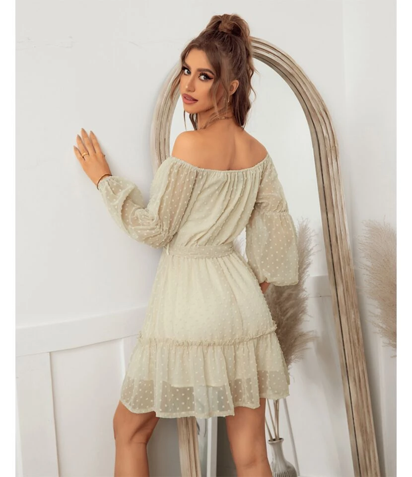 Sexy Off Shoulder Flocking Mini Dress Solid Color Long Sleeve Lace Up Flowy Wholesale Dresses SDN560434