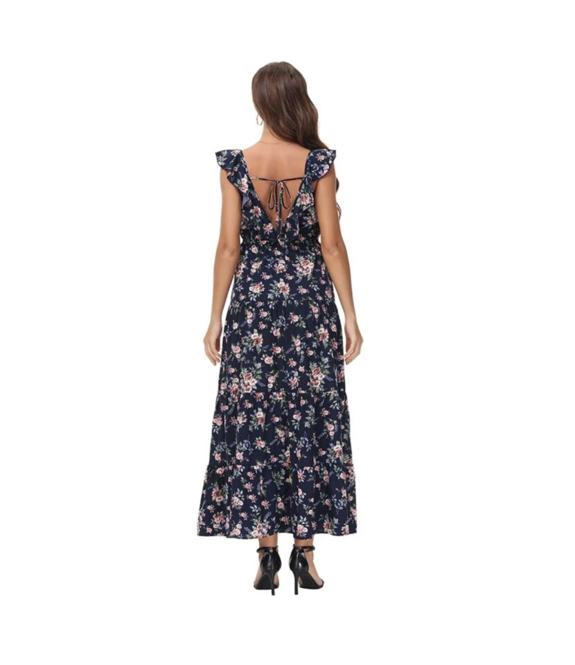 V Neck Ruffled Sleeve High Waist Vacation Smocked Floral Dress Wholesale Maxi Dresses SDN534610