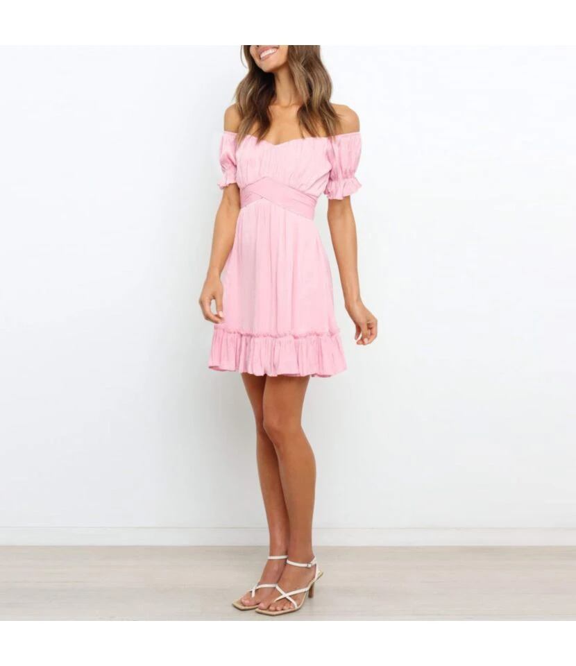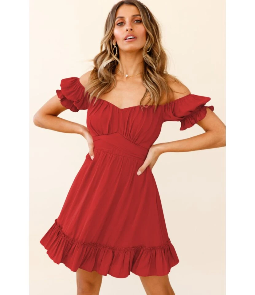Solid Color Puff Sleeve Ruffles Off Shoulder Tied Rope Vacation Dress Wholesale Dresses SD203764