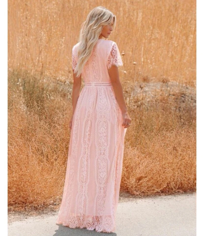 Solid Color V Neck Short Sleeve Lace Hollow High Waist Swing Wedding Dress Wholesale Maxi Dresses SDN533089