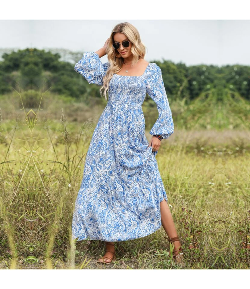 V-Neck Tie-Up Flared Sleeve Boho Slit Maxi Dress Wholesale Bohemian Dress For Women SDN536216