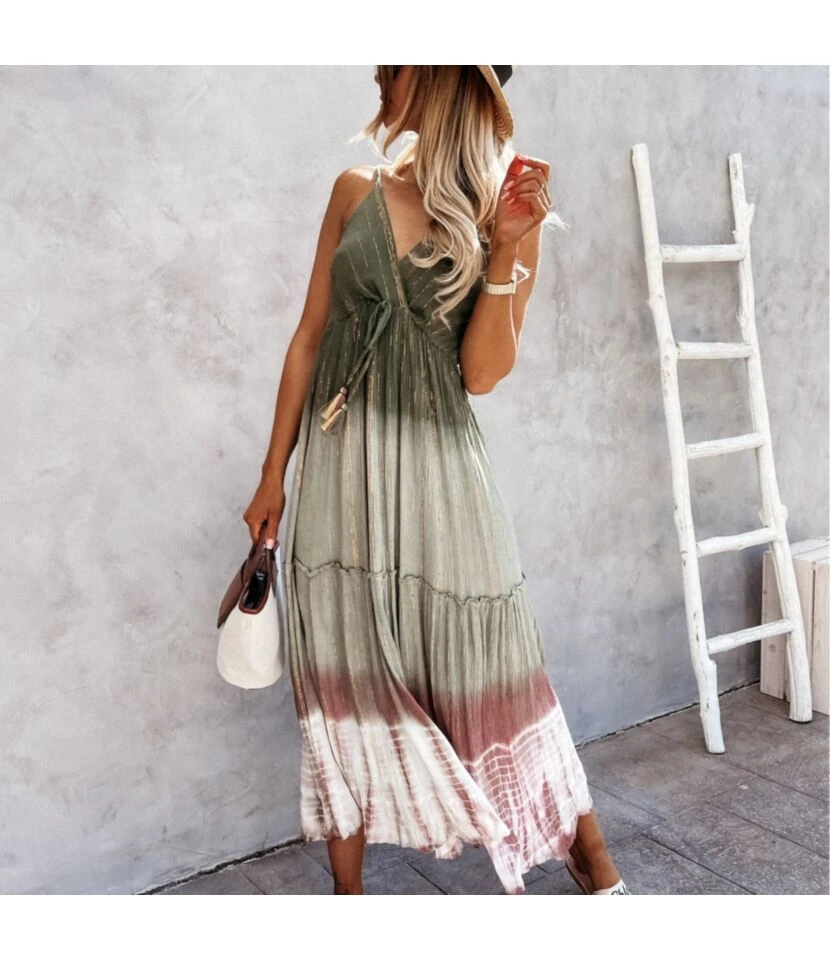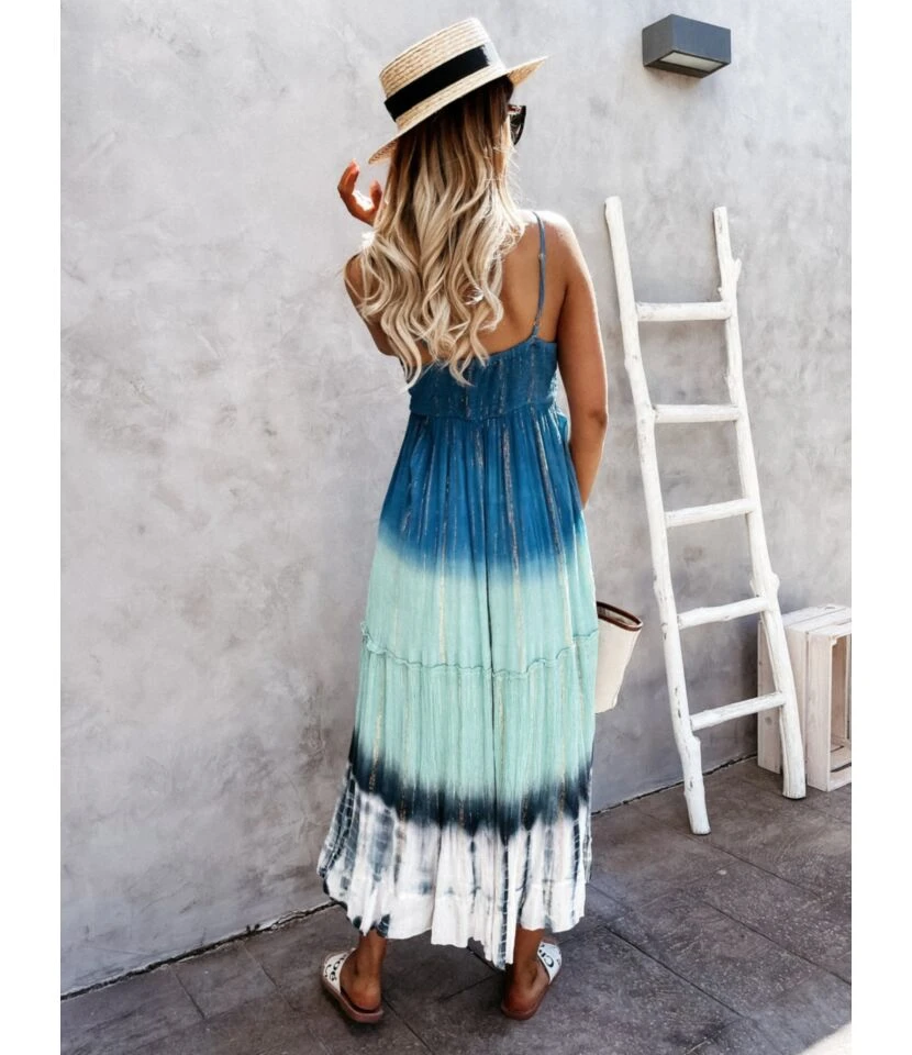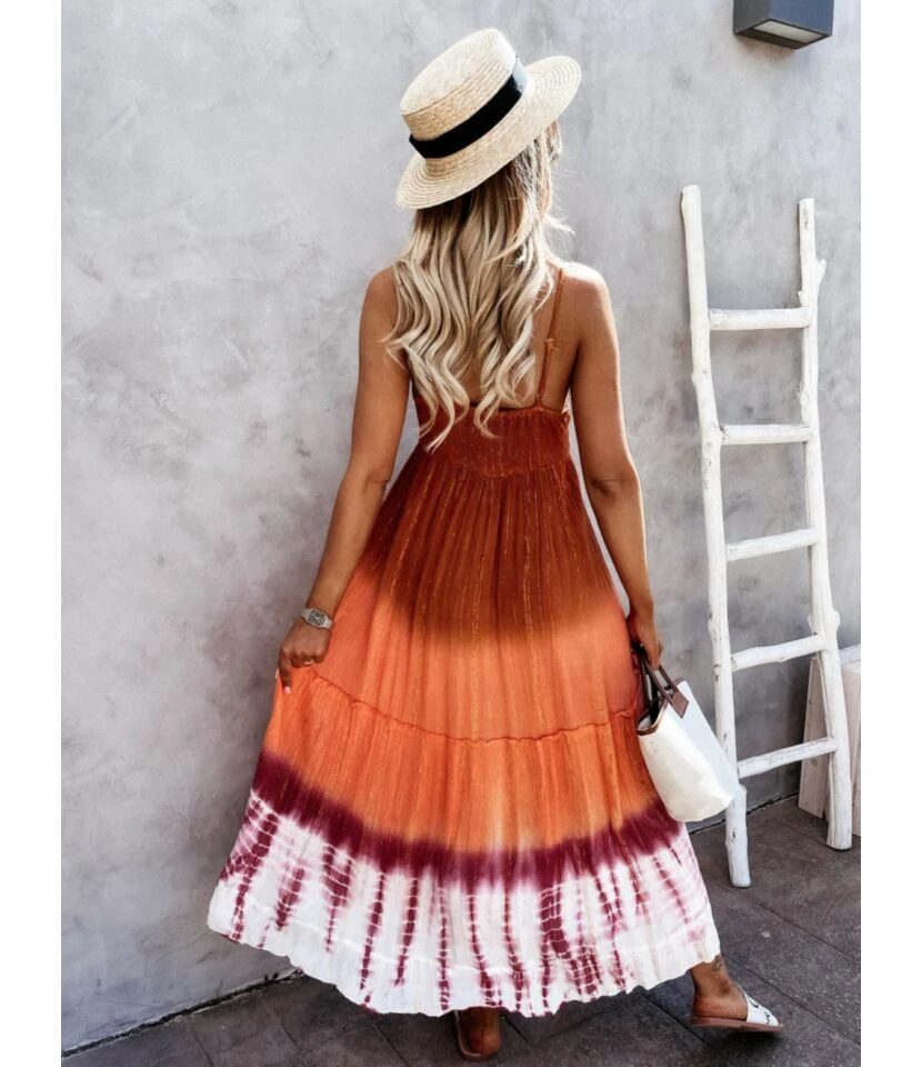 Tie-Dye Print V Neck Fringe Sling Sundresses Holiday Slip Swing Ruffled Dress Wholesale Maxi Dresses SD531876