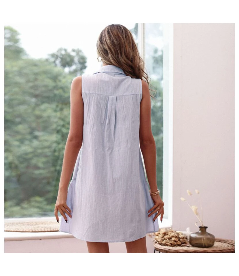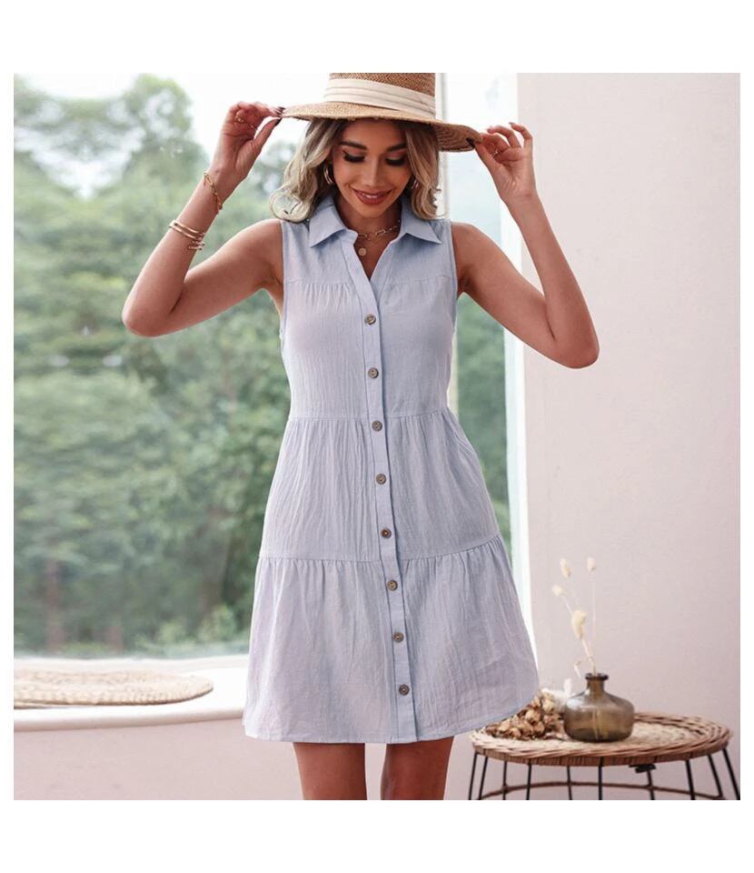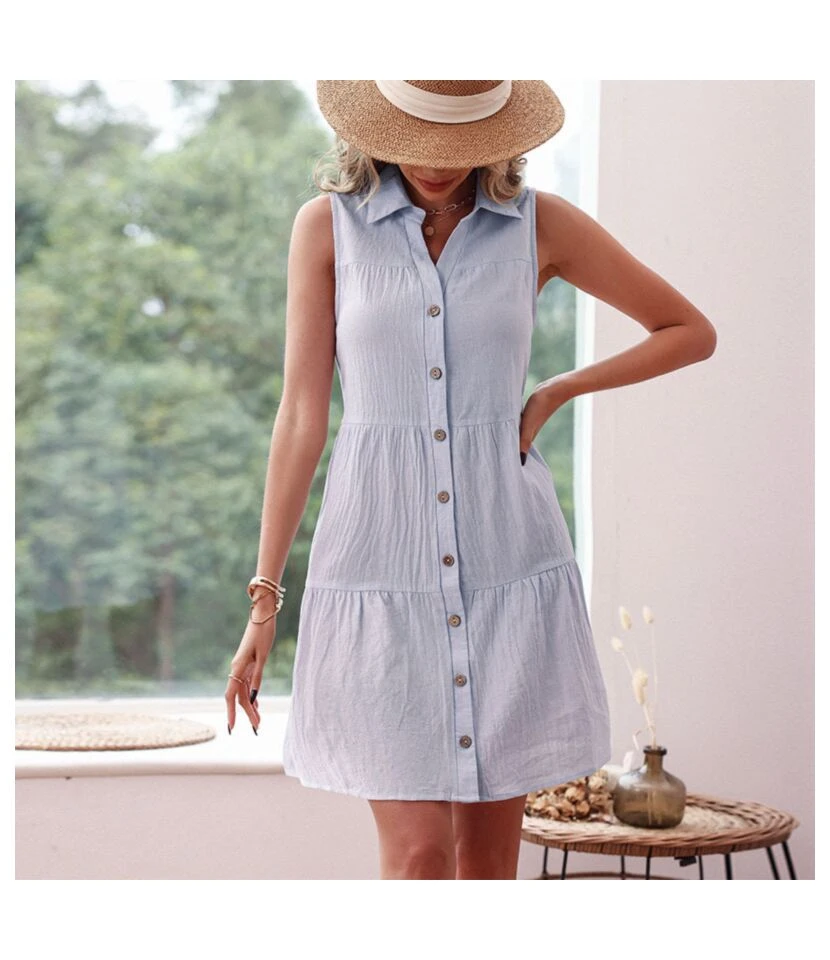 Women Fashion Turn Down Collar V Neck Button Cotton Linen Wholesale Tank Dresses SD168353